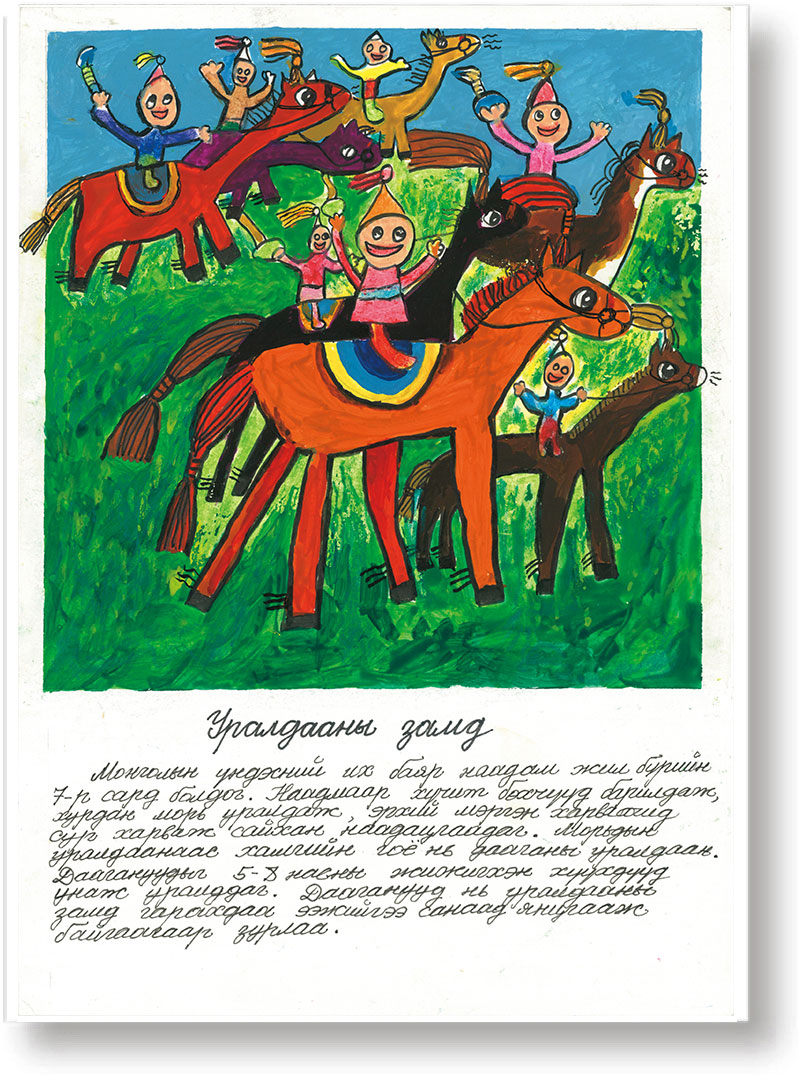 July. At Naadam, wrestlers compete on strength, horses compete on speed, and archers compete on