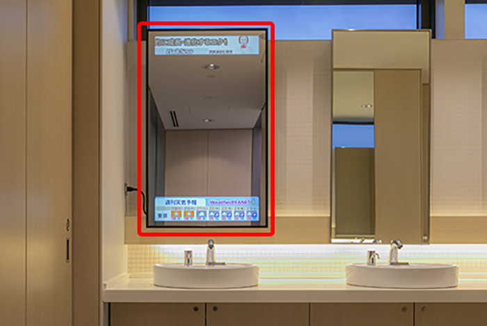 In this initiative, the Mirroria has been installed in the restrooms on each floor occupied by Mitsubishi HC Capital and AGC, displaying advertisements along with weather and news information for employees. In the next phase, the three companies plan to recruit several advertising firms to assess the effectiveness of the advertisements shown on the mirrors and then develop new services based on the findings.