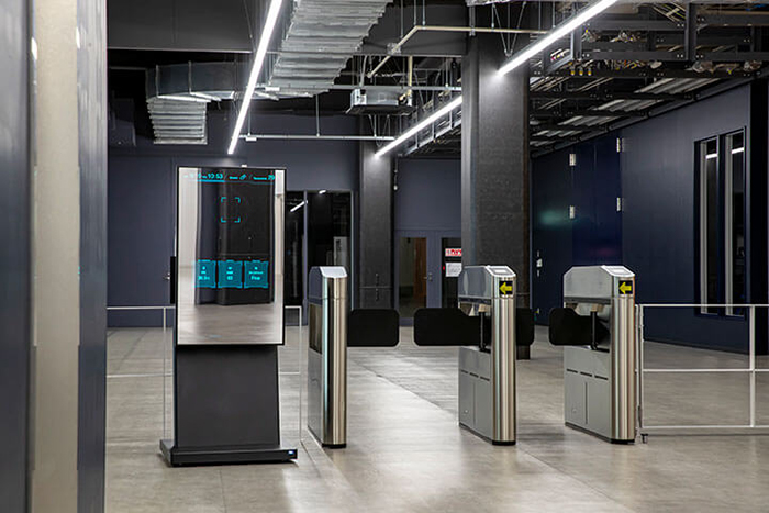 (Left) Illustration of Mirroria installation at an office entrance (Right) Face recognition and health checks