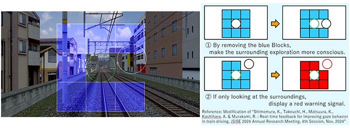 One result of joint research is a support function that speeds up the detection of abnormal events in the vicinity of railroad tracks. The white circle shows the driver’s point of focus, and the blue color shows the surrounding blocks (search range). The display automatically adjusts to match eye movement so that drivers can learn to balance their attention between the forward view and their surroundings.