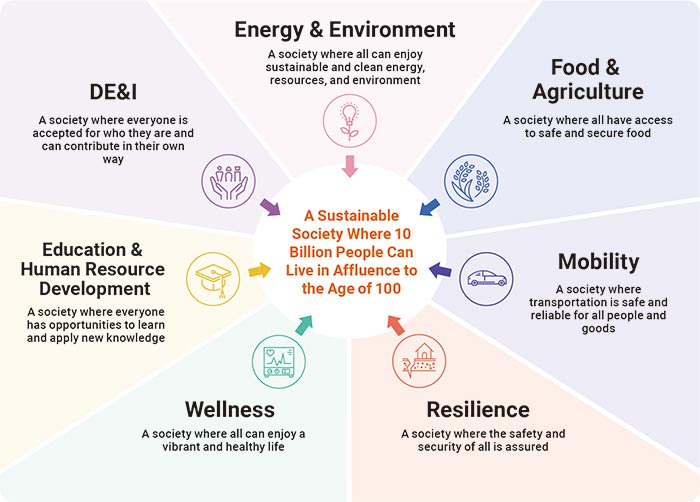 The goal is to achieve a sustainable society where 10 billion thrive into their 100s