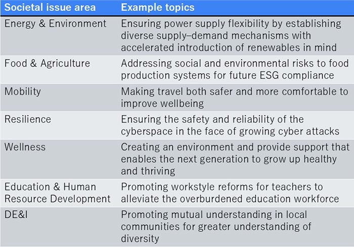 For instance, in the 30 themes and seven domains of the 2025 edition, the Energy and Environment issue area identifies “Ensuring flexibility in electricity supply and demand management” as the challenge in response to the issue “Accelerated introduction of renewable energy leads to unstable power supply.” In the case of the Food and Agriculture area, the problem of “Insufficient food production systems to accommodate future ESG requirements” will be met by the issue of “Addressing environmental and social risks in the food production supply chain.” The newly added DE&I issue area tackles the “Lack of workforce diversity” by addressing the challenge of “Creating an environment that leverages individuals regardless of personal attribution.” These can offer companies insights for finding new business opportunities and fostering innovation.