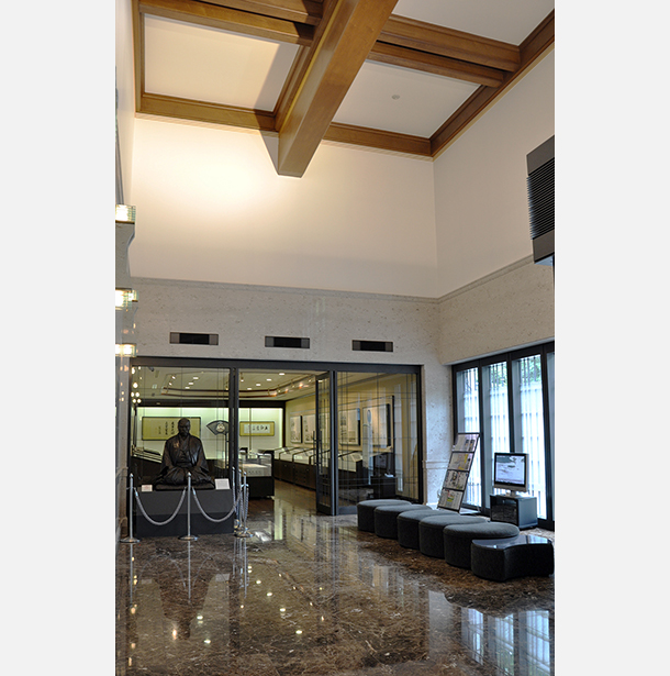 開放的なロビー。研修等に使われる会議室や応接室は、彦彌太邸の食堂・応接室を復元したもので、会議室の扉や机、椅子などの調度品は当時のものをそのまま使用している。