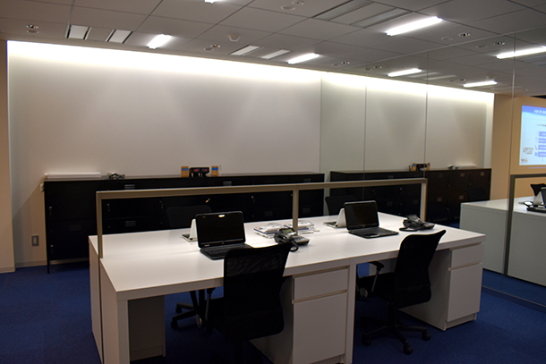 少ない光でも快適な環境を実現する、タスク・アンビエント照明によるオフィスの例。天井、壁面及び机上面に明るさを確保。