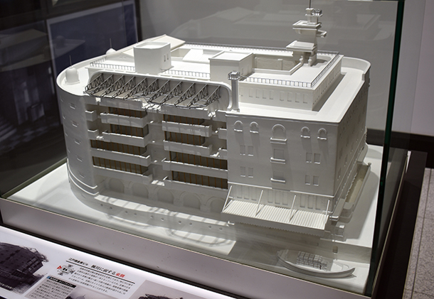 旧江戸橋倉庫ビルの模型。全体がまるで船のような設計。手前が日本橋川で、艀で運ばれてきた貨物をここで荷揚げした。