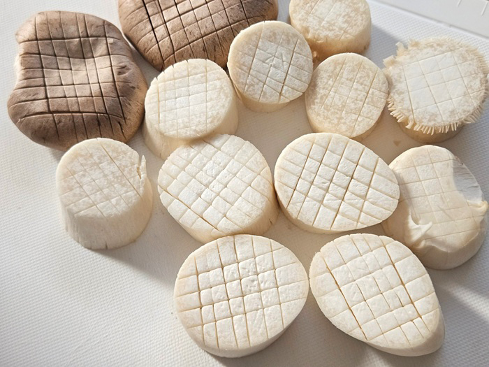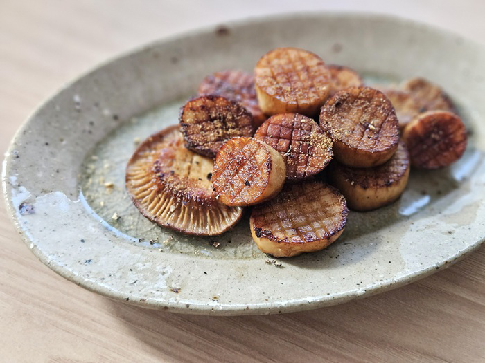 ① エリンギは厚さ約1cmに切り、表面に格子状に浅めに切り込みを入れる。切り込みを入れることで、バターの風味が広がり、味がなじみやくなる。