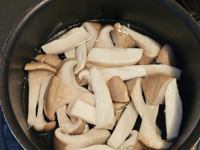 ① エリンギは長さを半分に切り、さらに縦4~6等分に切る。鍋に湯を沸かし、2分程度サッとゆでる。