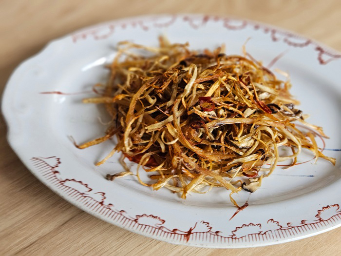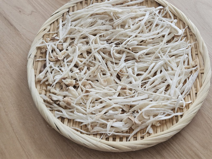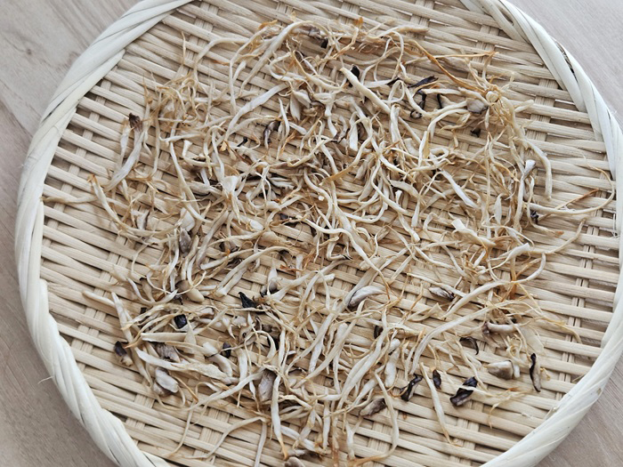 ① エリンギは細かく裂いてざるなどにのせ、2日ほど天日干しにしてセミドライに。
