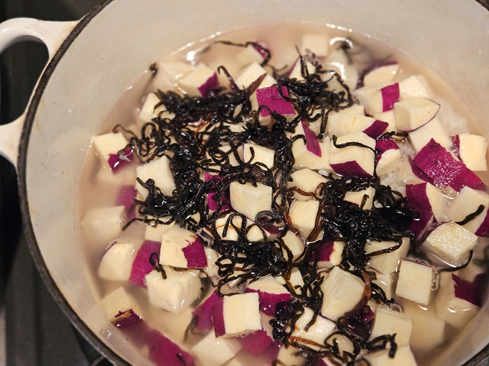 ② さつまいもは1cm角に切る。鍋に水気をきった米、水、さつまいも、塩昆布を入れ、ふたをして中火にかけ、沸騰したら弱火にして10分、蒸らし10分で炊き上がり(炊飯器なら、米を入れ2合分の水を入れてから、具材を入れて炊く)。
