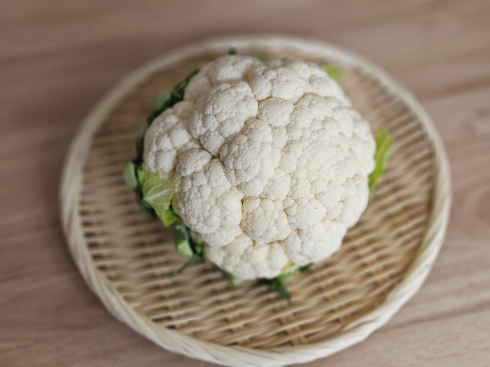 カリフラワーは花つぼみが白く、隙間なくぎゅっと締まっていて、ずっしりと重みがあるものを選んで。葉がついている場合はハリがあり鮮やかなもの、切り口の茎がみずみずしくきれいなものがより鮮度の高いサインです。