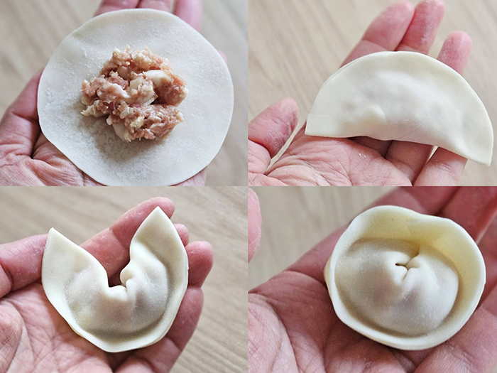 ③ ②を餃子の皮で包んでいく。皮の真ん中に具材をのせ(左上)、ふちにぐるっと水をつけてから半分に折りたたむ(右上)。さらに円を作るように両端を引き寄せ(左下)、水をつけてくっつける(右下)。