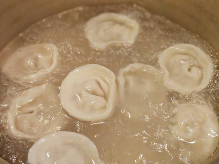 ④ 鍋にたっぷりと湯を沸かし、③を入れてゆでる。餃子が浮き上がってきたら1分半くらいゆで(トータル3分~3分半が目安)、皿にあげる。