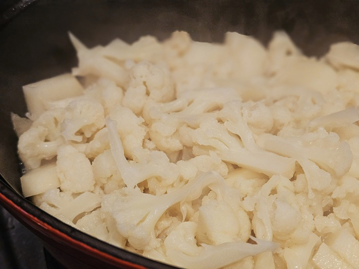 ② 厚手の鍋を火にかけてバターを溶かし、たまねぎを炒める。しんなりしてきたらカリフラワーとじゃがいもを加えてざっくり混ぜ、水100mlとブイヨンを加えてふたをして弱火で10分蒸す。