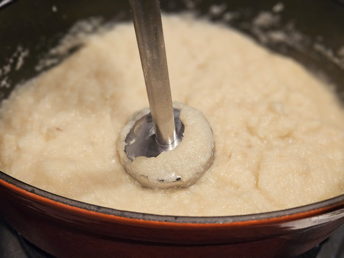 ③ ②に水300mlを加えて沸騰したら一度火を止め、電動ブレンダー(ミキサーでも可)でピューレ状にする。