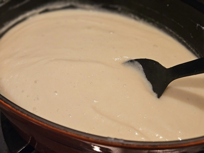 ④ 弱火にかけながら無調整豆乳を加え、ムラなくなめらかになるようにヘラなどで混ぜる。最後に塩で味を調える。