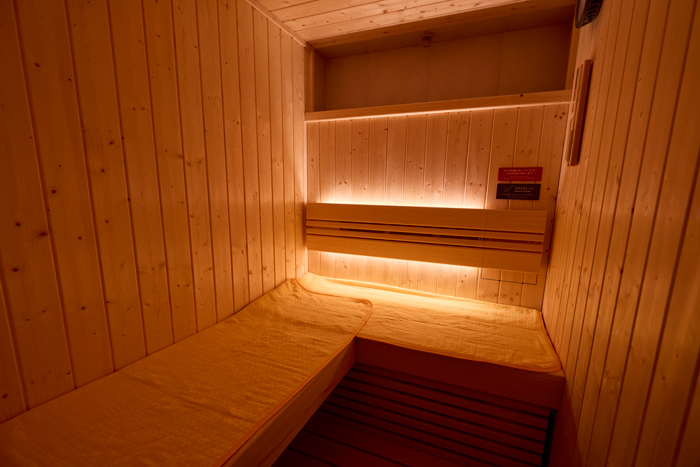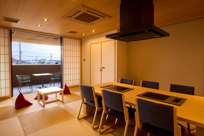 自家源泉の天然温泉、テラス、プロジェクター、畳スペース、IHクッキングヒーター埋め込みダイニングテーブル、ミニキッチン、洗濯乾燥機のほか、高温サウナも完備。