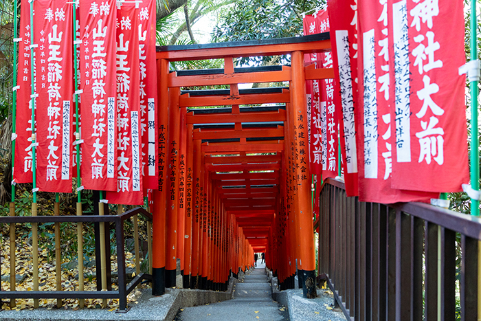 日枝神社の稲荷参道(千本鳥居)。朱色の鳥居が階段状に並ぶ。