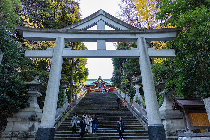 石造の明神鳥居をくぐり石段「男坂」を上がれば本殿が見えてくる。