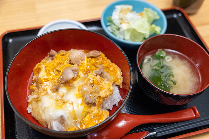 鶏肉の弾力とうま味がしっかり感じられる親子丼。割り下は砂糖を使わず、みりんと自然な甘みを堪能できる。