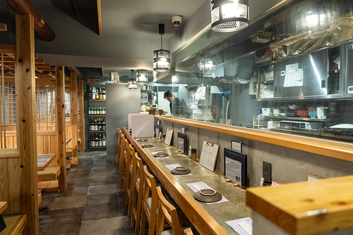 店内は落ち着いた木を基調とした内装。清潔感があり、接待や会食にも使える上品な空間にお酒がすすむ。