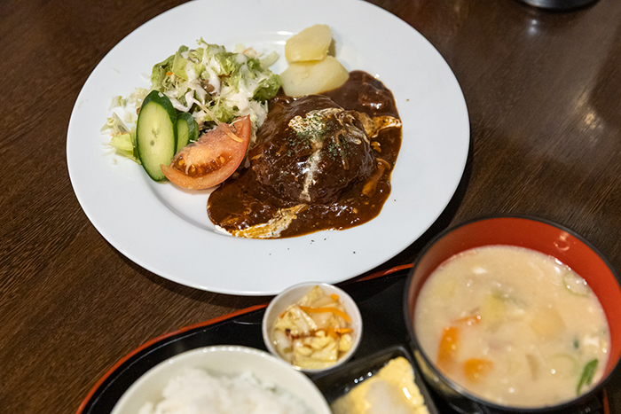 人気のハンバーグ定食。コクのあるソースと肉汁たっぷりのハンバーグにご飯がすすむ