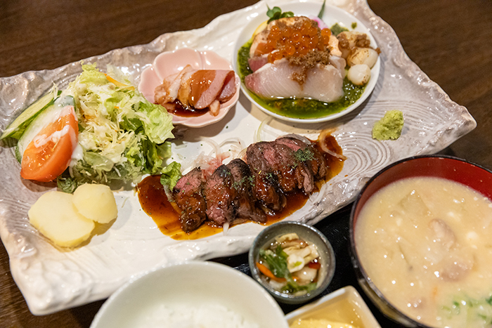 支店から近く、ランチ時でも並ばなくて入れるところがいい。「とにかくおいしいですね。とくにお米がいい。ランチは日替わりのA定食がオススメ、冬ならチゲ鍋定食もあります」(菅田さん)。「創食と銘打っていますが洋食系で、量もあり、しっかりおいしい。コスパもいいですね」(渡邊さん)。訪問時のA定食はハンバーグ定食(1,210円)だった。他にステーキ定食(1,650円)、チゲ鍋定食(1,430円)など。全品国産米100%使用。ご飯の多めは無料。豚汁は酒粕入り。本当に満足度十分。営業時間は、昼は11:30 - 14:30(L.O. 14:00)、夜は17:30 - 22:00(L.O. 21:30)。月曜定休。