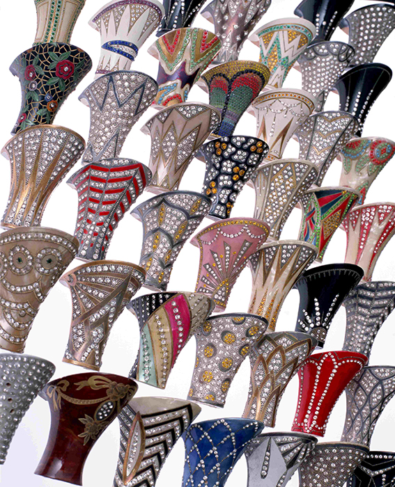 靴を誂える際のヒールのサンプルを撮影したもの。華やかなラインストーンが特徴的。