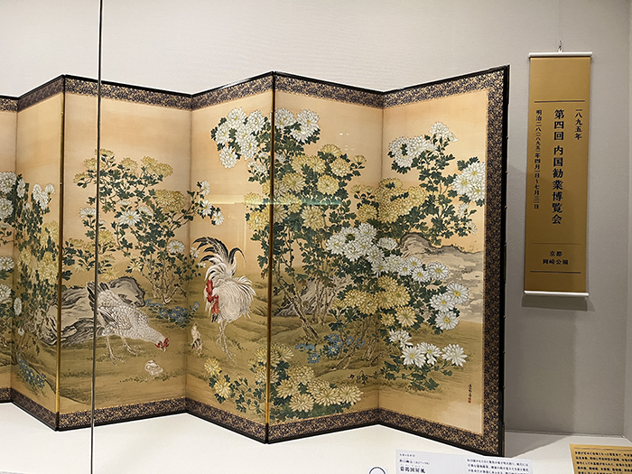 第四回内国勧業博覧会開催前年に没した京都府知事の中井弘の企画を、懇意にしていた彌之助が資金面でバックアップした、東西の日本画家による屛風の競演。そのうちのひとつ、野口幽谷の六曲一双屛風「菊鶏図屛風」は前期に右隻(写真)を、後期に左隻を展示。