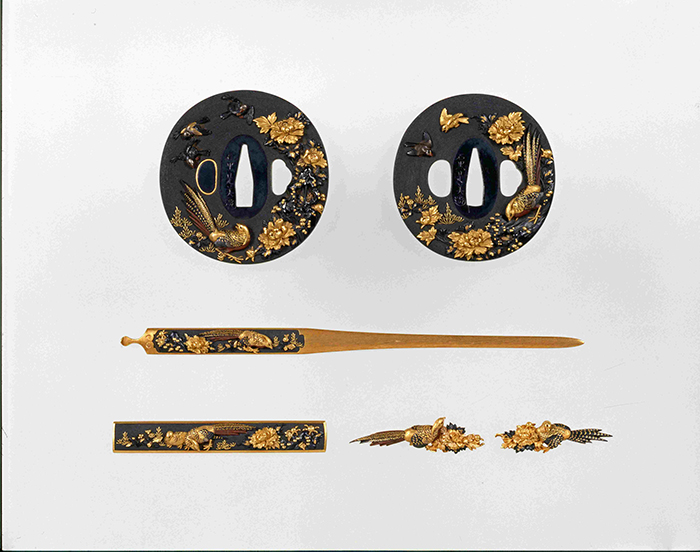 刀剣は本体だけでなく、鞘や鐔、そして外装に付ける金具の一種である「三所物」に施された工芸も見どころ。本作は、花鳥を題材として絢爛な作風で知られる石黒派屈指の名工、是美の代表作といわれる。