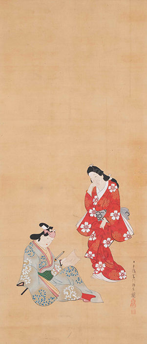 “浮世絵の祖”といわれ、東京国立博物館が所蔵する「見返り美人図」で知られている菱川師宣。右手の甲で口元を隠し、左手で着物の褄をとるという師宣美人の定番ポーズをとる本作の女性は、「見返り美人図」の女性と同じく当時流行の髪型で、浮世絵が当世を写すものだということをよく示している。日英博覧会出品作。