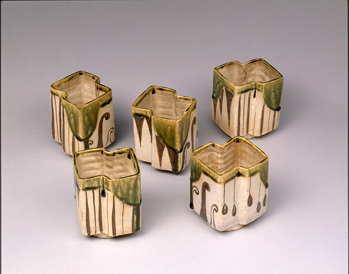 慶長から寛永年間にかけて、美濃で制作された織部焼の向付。形だけでなく、緑と白の対比や抽象的な文様など、斬新な装飾が光る。