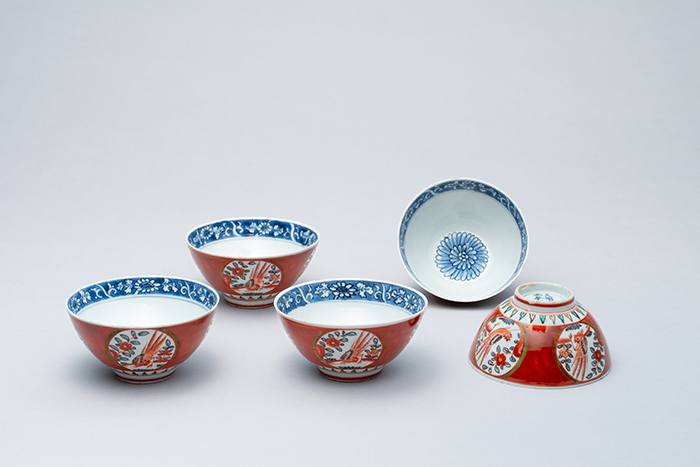 金襴手の作品にも通じる意匠の碗。見込みの意匠は染付で、外側の丸窓には花鳥図が。