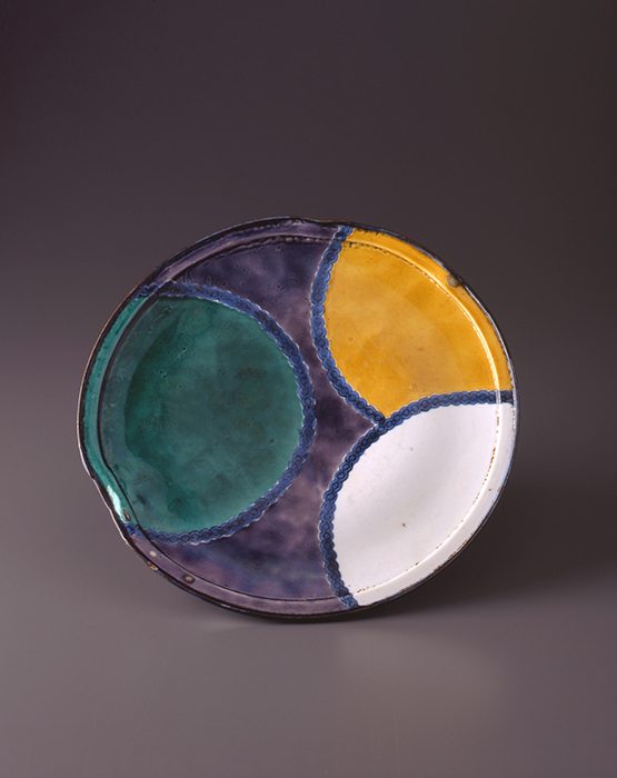 染付の鎖文で囲まれた緑、黄、白の丸文が、大胆なトリミングで配された台鉢。縁に軽やかな歪みをつけた、古伊万里の「古九谷様式」と呼ばれる逸品。