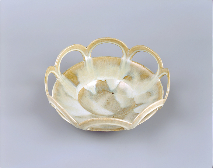 花形の縁に、大きく透かしを切った仁清の鉢。秀逸なデザインと、景色をつくる白釉の流れが見どころ。