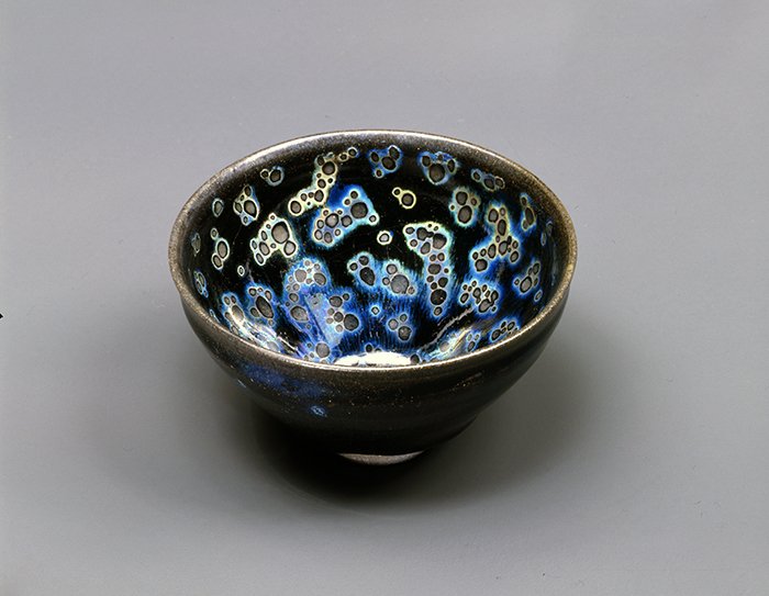 「天目」と呼ばれる黒釉碗のうち、世界に3碗のみ完品が伝わる「曜変天目」。大小の斑紋の周囲に現れた青光りする光彩が特徴。徳川将軍家から淀藩主の稲葉家に伝来したのち、岩崎家の所有となった。