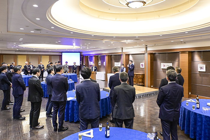 そのあと、三菱広報委員会 幹事長で三菱商事 広報部長の岡本 卓馬氏、副幹事長で三菱重工業 グループ戦略推進室の高野 修一広報部長、明治安田生命保険 執行役員山田 克己広報部長が登壇。三菱商事岡本広報部長が乾杯の挨拶を行った。