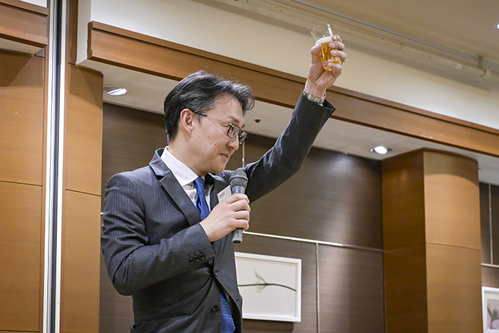 乾杯の挨拶を行った岡本卓馬 三菱商事広報部長