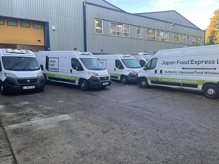 JFE 英国倉庫前の写真。早朝から深夜までシェフたちにこだわりの商品をお届けしている。