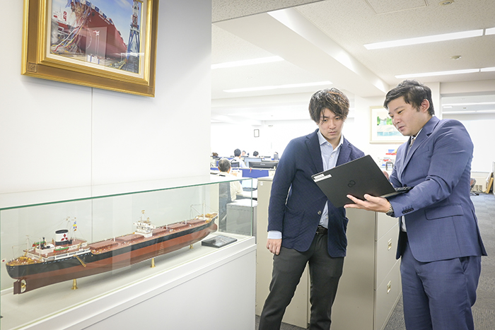 「航海がひとつ終わったときに、やり切ったと感じます。また、用船者の方や代理店の方は普段メールや電話でしかやりとりができない分、直接お会いする機会があるととてもうれしいですし、このご縁を大切にしなければいけないと感じます。最近は室蘭に行きました。これから初の乗船研修があるので、とても楽しみにしています。将来は海運のオールラウンダーになりたいですね」