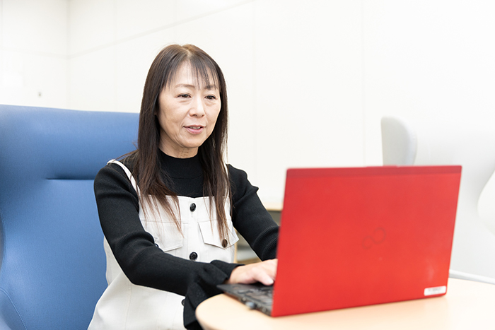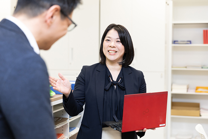 法人課の秋光 典子さんは地元岡山出身で岡山支店一筋。現在は法人課アソシエイトとして営業員のサポート、担当者不在時の顧客対応に従事し、注文の受発注、電話対応、事務手続きのフォロー、スケジュール管理までを手掛けている。