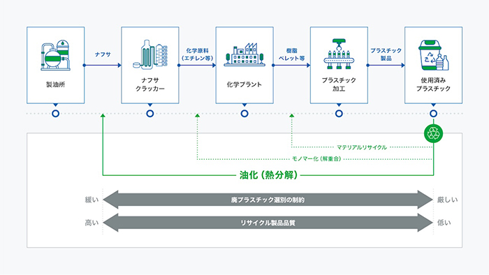 三菱ケミカルとENEOSが共同で推進する使用済みプラスチックを油化するケミカルリサイクルは今後どのようなインパクトを社会にもたらすのだろうか。