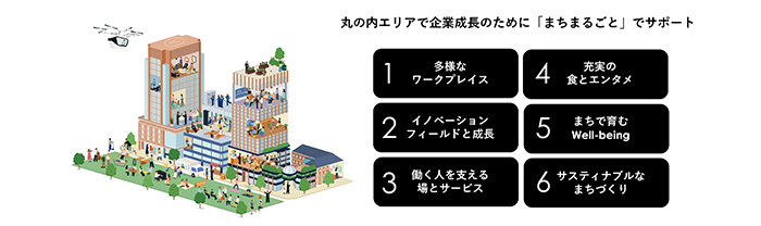 丸の内エリアの特性のひとつは、135年以上にわたるまちづくりを通して、多くのステークホルダーとともに築き上げてきた「利便性と集積」にある。その特性をふまえ、テナント企業が自社オフィスだけでは実現できないことや、個別企業の取り組みではなかなか実現しにくいことを「まちまるごと」でサポート、エリア全体をプラットフォームとして機能させ、コワーキングスペース、ラウンジ、休養室といったオフィスに求められる機能を提供するほか、企業や人の交流、イノベーション創出まで、働き方の質や事業成長を高めていく狙いがある。