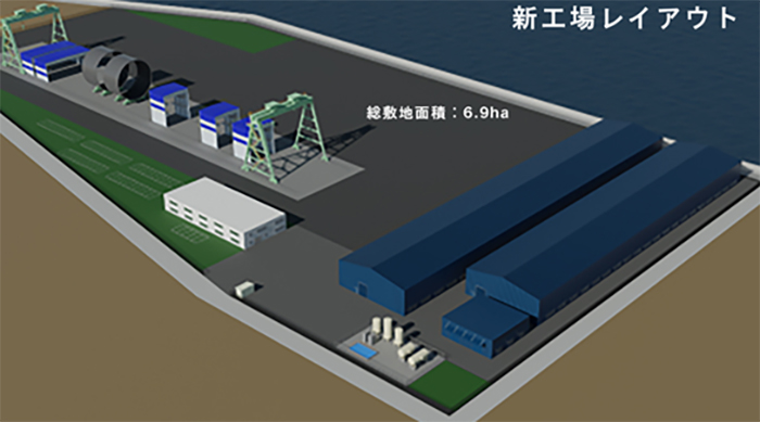 つくるのは風車を支える土台となる「浮体基礎」。投資額は第1期で約30億円、第2期と合わせ総投資額約46億円を投じる。同社としては最大規模の投資となる。150tのクレーンを擁する屋外のクレーンヤードは2026年12月頃、建屋については2027年夏頃には稼働する予定だ。
