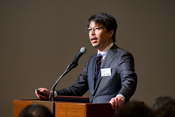 助成金贈呈式に先立って、助成プロジェクトの成果を報告する研究成果報告会が行われ、自然科学分野から林克彦氏が、人文科学分野から香西豊子氏が登壇しました。