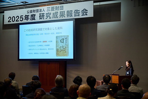 続いて登壇したのは、2022年度の人文科学研究助成を受けた佛教大学社会学部教授の香西豊子氏。研究テーマ「近代日本における伝染病への制度的弾性(レジリエンス)に関する実証研究」について「公衆衛生のジレンマ」という題目で発表を行いました。研究内容は、明治時代に東京市唯一の常設伝染病院として機能した駒込病院の医局日誌をもとに、近代日本における伝染病対策の足跡を辿るというもの。原本の保全を図りつつ全ページの写真撮影および写真データのバックアップを行い、周辺資料と照合しながら伝染病に対する一般市民の意識や国の対応・対策といった社会の変遷を紐解いていきました。