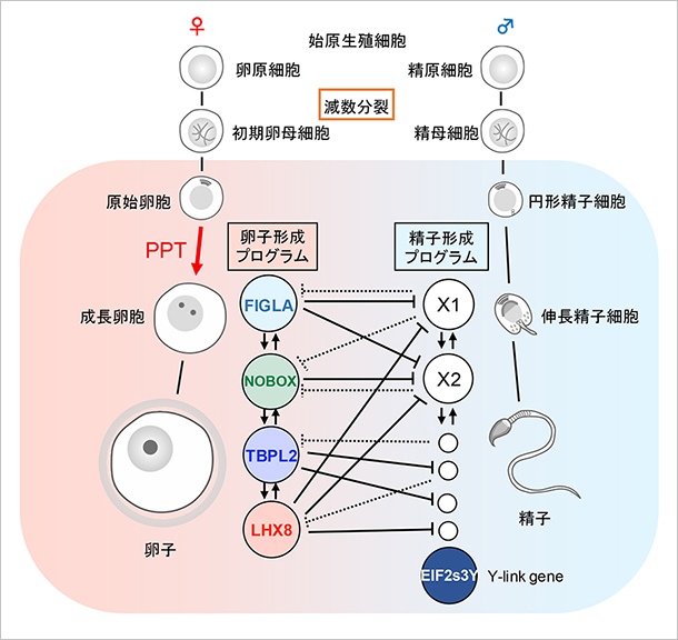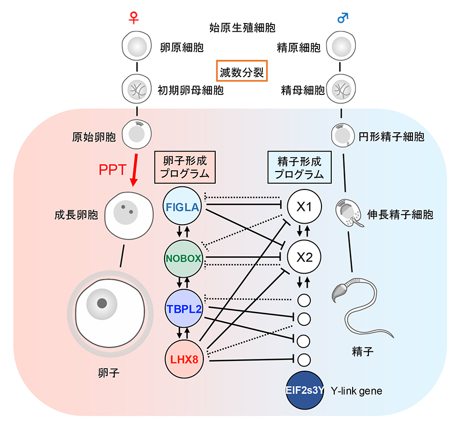 相互抑制の概要。卵子形成プログラム(左側)の4つの遺伝子が精子(右側)形成を抑制している。精子側から卵子形成を抑制する働きの解明も進められている。