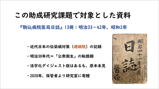 「突発的に流行する伝染病に対応するために公衆衛生が強化され、個人の生活に介入していきました。このような状況で書かれたのが駒込病院の医局日誌です」