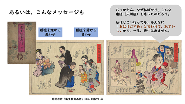「江戸末期に日本に紹介された種痘の接種は明治に入り義務化されます。免疫のない子どもに種痘を受けさせるために、『子に種痘を受けさせるのは母のつとめ』と子の親、特に母親の公徳心に訴えながら義務を強化してゆき、さらには法制化を進めていきました」