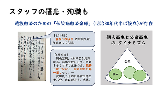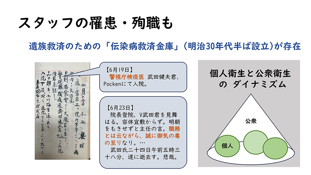 「病院のスタッフで罹患して亡くなってしまう方もいたという記録も出ています。公衆衛生に尽力する人も、個人の中で葛藤を抱えながら従事していたことが読み取れました」