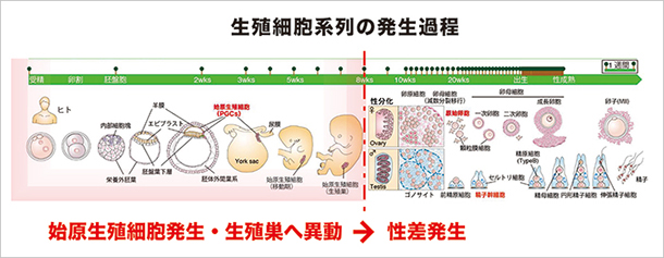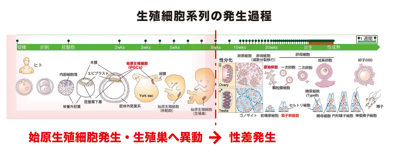 「卵子や精子のもととなる『始原生殖細胞』は、赤ちゃんの頃から存在しています。受精卵から始まり胎児となる過程で、途中まで形は一緒です。この細胞が将来の卵巣や精巣になる場所(生殖巣)に入りこむと、そこではじめて性差が生まれます」